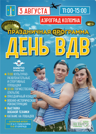 3 августа Коломна отметит главный профессиональный праздник «голубых беретов». В этот день на территории аэрограда «Коломна» будут работать культурно-развлекательные и спортивные площадки, гости смогут увидеть военно-историческую реконструкцию и выставку военной техники. Праздничный концерт, катание на лошадях, мастер-классы и многое другое – праздник обещает подарить массу впечатлений и приятных воспоминаний.