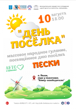 10 августа в 18.00 приглашаем жителей и гостей поселка Пески на праздничное народное гуляние «День поселка», которое состоится в парке у памятника «Воину-освободителю».