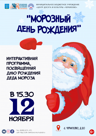 12 ноября в МБУ «ЦДиК «Черкизово» состоится интерактивная программа для детей и подростков, посвящённая Дню Рождения Деда Мороза «Морозный День Рождения». Начало в 15.30