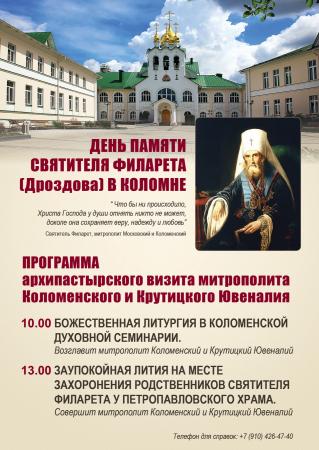 В 10:00 состоится Божественная литургия в Коломенской духовной семинарии, а в 13:00 на месте захоронения родственников святителя Филарета у Петропавловского храма пройдет заупокойная лития.