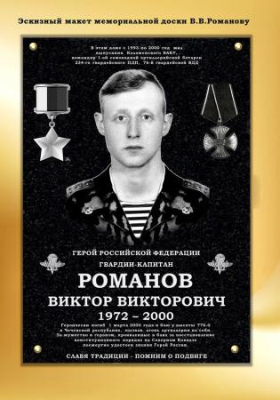 22 февраля на доме 6 по улице Спирина в Коломне откроют мемориальную доску Герою России Виктору Романову, выпускнику Коломенского высшего артиллерийского училища. Он погиб 1 марта 2000 года в составе легендарной 6-й роты Псковской воздушно-десантной дивизии в Аргунском ущелье.