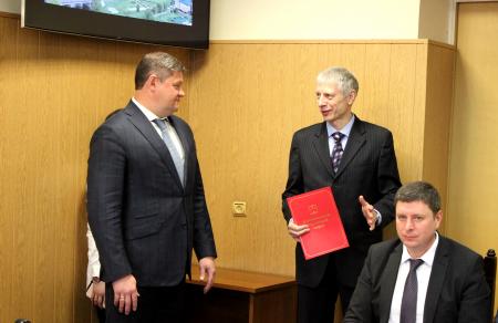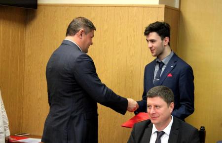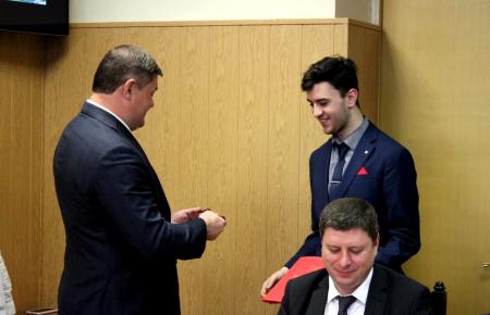 Глава Коломенского городского округа Денис Лебедев вручил награды мастеру спорта международного класса, победителю Первенства Мира среди юниоров 2020 года на дистанции 5000 м Даниилу Алдошкину и директору Спортивной школы олимпийского резерва по конькобежному спорту «Комета» Борису Репнину.