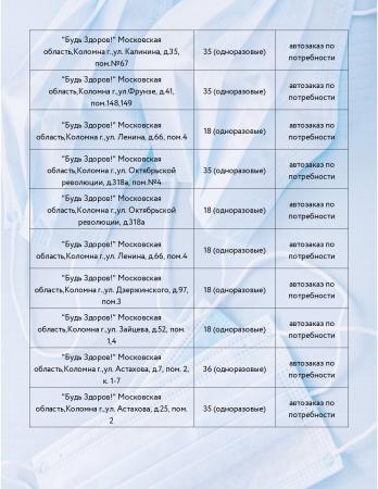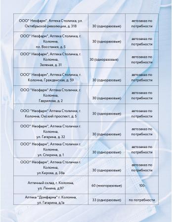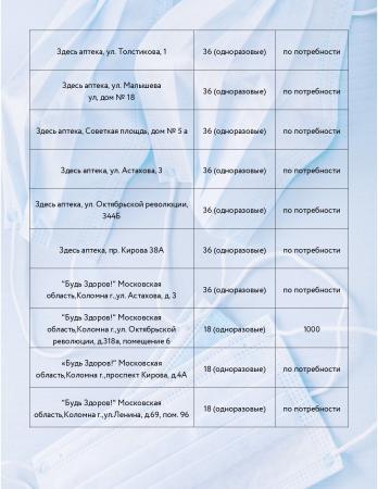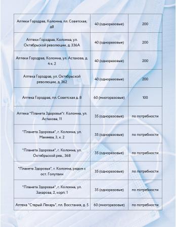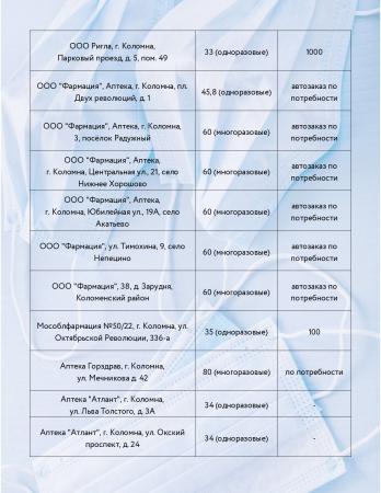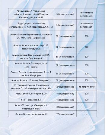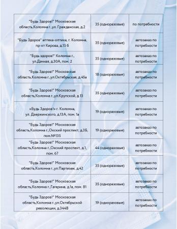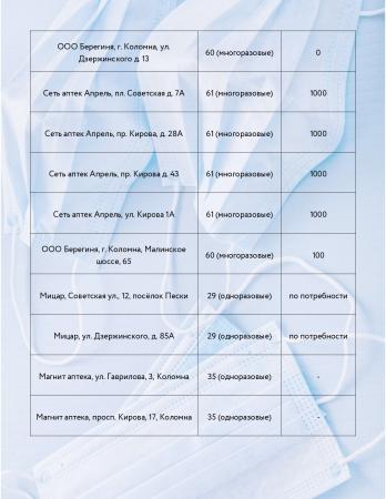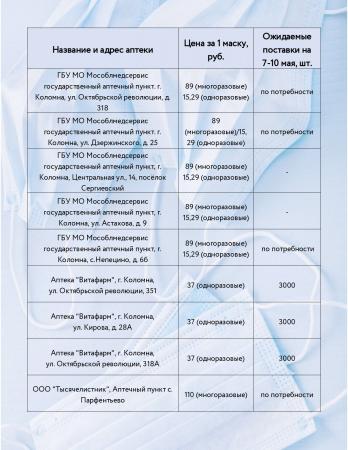 В муниципалитете создан необходимый запас масок. Их можно купить в государственных и коммерческих аптеках, которых в округе около 100. С их списком, адресами, планируемыми поставками и ценами на защитные маски можно ознакомиться в таблице.