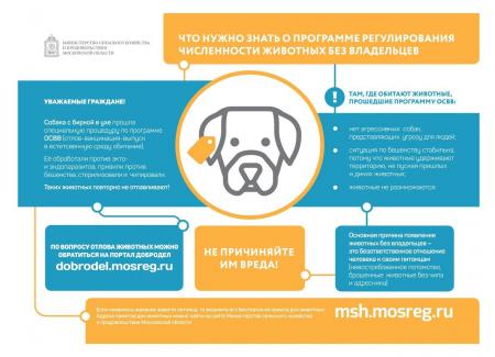 Министерство сельского хозяйства и продовольствия Московской области продолжает разъяснительную работу о программе гуманного регулирования численности бездомных животных и представляет памятку о данной программе.