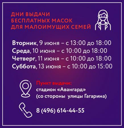 Раздача средств индивидуальной защиты органов дыхания организована на стадионе «Авангард» со стороны улицы Гагарина. Для получения набора из 20 масок при себе необходимо иметь паспорт.