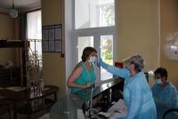 Приезжающие в профилакторий на лечение работники Коломзавода должны быть в масках и пройти через "входной фильтр", где измеряют температуру тела с помощью бесконтактного градусника.