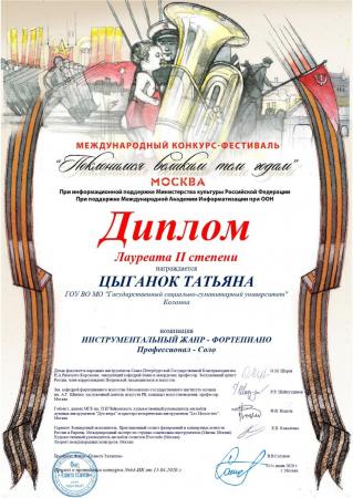 Старший преподаватель кафедры музыки Государственного социально-гуманитарного университета Татьяна Цыганок стала лауреатом II степени в Международном конкурсе-фестивале «Поклонимся великим тем годам».