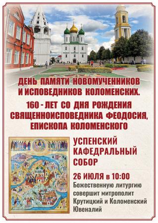 В воскресенье, 26 июля в Успенском кафедральном соборе пройдет Божественная литургия по случаю Дня памяти новомучеников и исповедников коломенских, а также в честь 160-летия со дня рождения священноисповедника Феодосия, Епископа Коломенского.