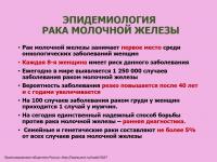 Рак молочной железы занимает первое место в структуре онкологических заболеваний женщин. Причем заболеваемость растет, что связано и с увеличением продолжительности жизни, и с улучшением качества диагностики. Ежегодно в мире выявляется более 1,25 млн случаев заболевания раком груди, в России – около 50 тыс. случаев, что составляет примерно пятую часть всех опухолей у женщин.