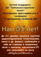 В новом челлендже коломенцам предлагают вспомнить все свои события, связанные с «Тепловозостроителем». Эмоции и пожелания нужно выразить в небольшом видеопоздравлении и выложить в своих аккаунтах на странице в социальных сетях с хэштегом #ДКТепловоз85 или прислать на электронную почту учреждения: dkteplovoz21@mail.ru