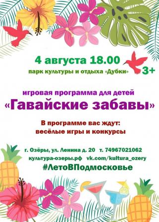 В парке культуры и отдыха «Дубки» в Озёрах состоится развлекательная программа для детей – «Гавайские забавы». Праздник пройдет 4 августа в 18:00. В программе вас ждут: весёлые игры и конкурсы, не забудьте захватить с собой хорошее настроение.