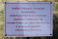 Уже сейчас проведены монтажные работы, но пока горожане могут видеть лишь очертания бюста, сам он скрыт за тканью. Рядом установлена табличка: «Торжественное открытие памятника генеральному конструктору ракетных комплексов, Герою Социалистического Труда» С. П. Непобедимому состоится 13.09.2021 г.».