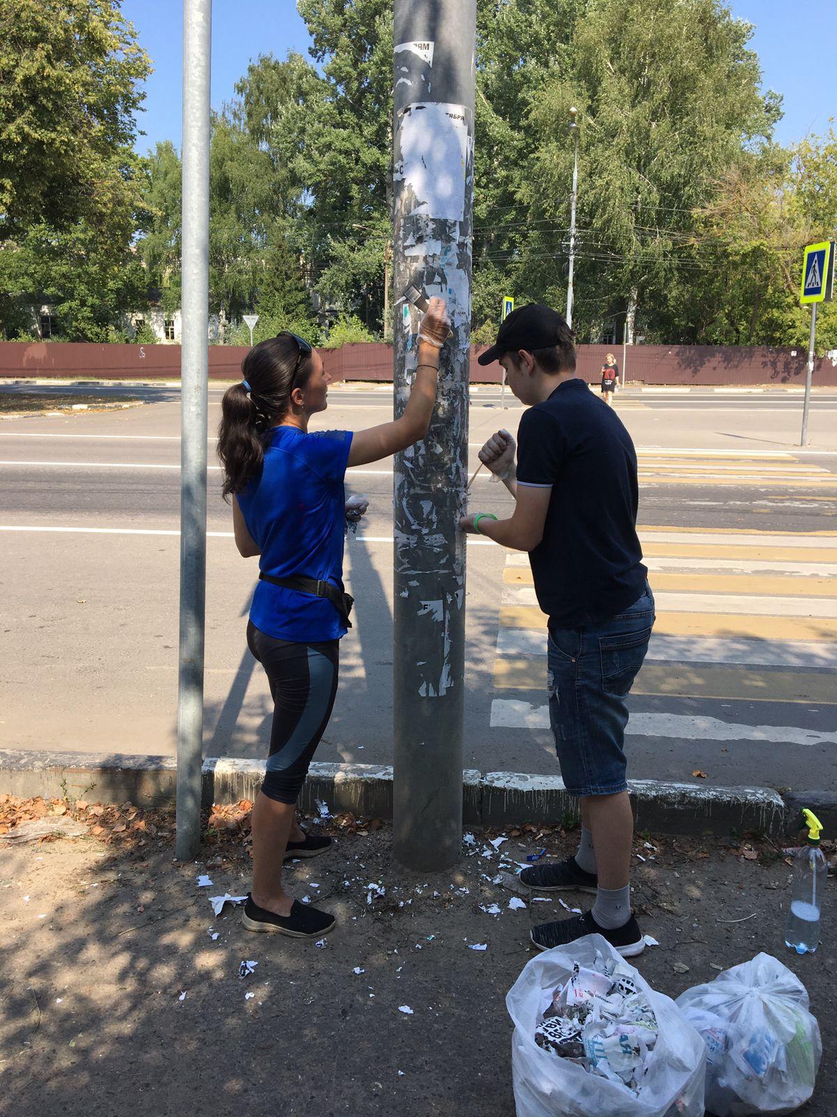 Маршрут прошёл от административного здания до микрорайона им. Маршала Катукова. Для расчистки рекламы с труднодоступных мест были использованы шпателя и специальные растворы. Дружная команда за два часа работы собрала более 30 мешков мусора с несанкционированными рекламой и объявлениями.