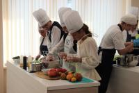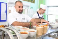 Во время мастер-класса кабинет превратился в кухню настоящего ресторана, а коломенские школьники и их учителя – в большую команду поваров. Одни занимались заготовками, вторые - холодными закусками, а третьи – горячими блюдами. У каждого цеха был свой су-шеф – ассистенты Владимира Мухина. Спустя час совместной работы на обеденном столе появились брускетта с томатами, тыквенный суп и голубцы из кролика. Все блюда приготовлены на пару, а порции украшены по правилам современной ресторанной подачи.