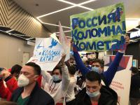 #КоломнаКатит, Россия/Коломна/Комета – слова с плакатов волонтёров Подмосковья, которые встречали наших конькобежцев с 23-их зимних Олимпийских игр. «Золотой рейс» с российскими спортсменами совершил посадку в аэропорту Шереметьево вчера, 21 февраля, в районе 18:30.