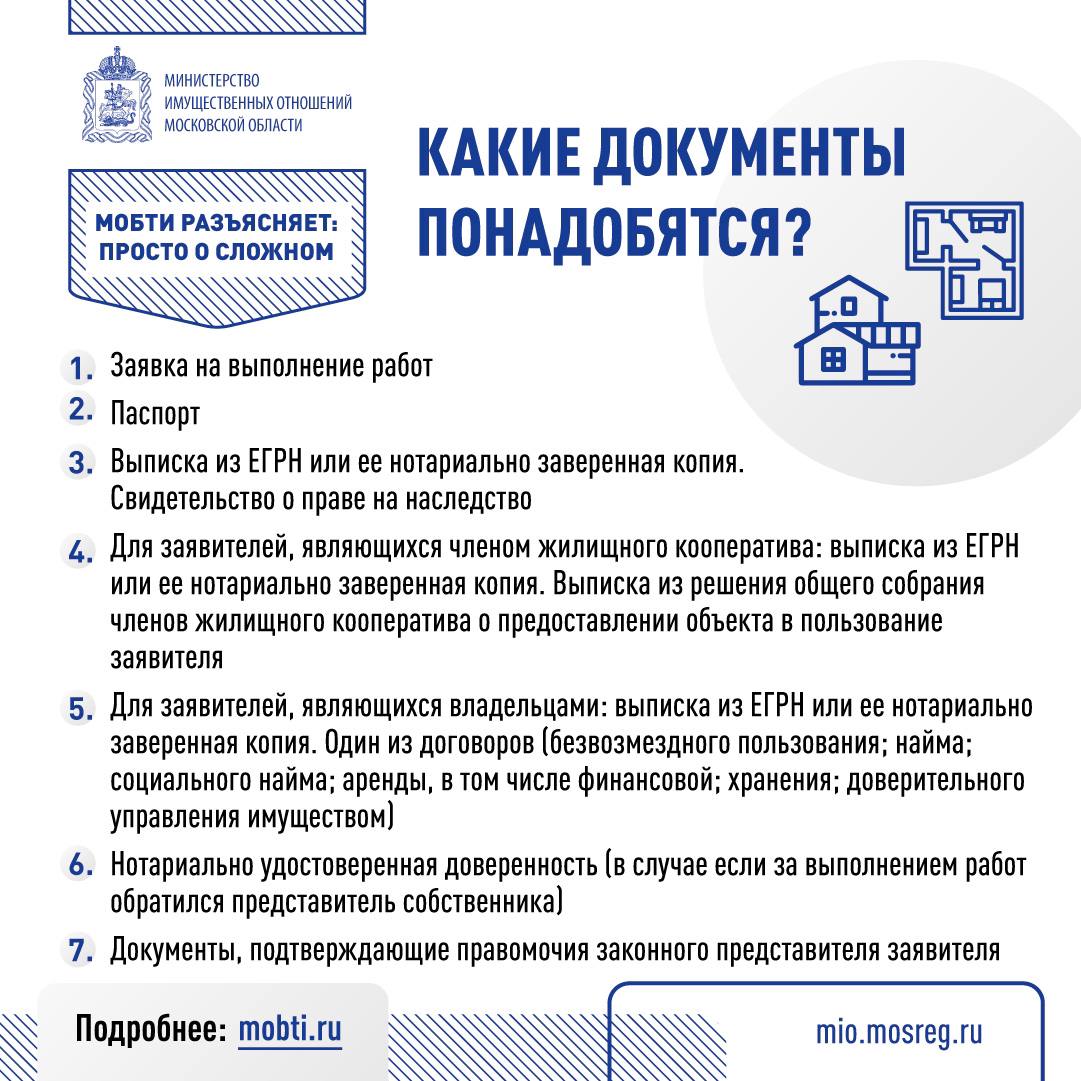 В перечень услуг входят: предоставление технической инвентаризации квартиры, технической инвентаризации объектов капитального строительства, технического плана объектов капитального строительства, акт обследования, а также изготовление копий технических паспортов объектов недвижимости.