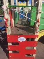 Специальные наклейки продолжают информировать жителей округа о дате ремонта игровых элементов