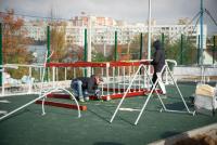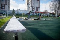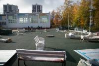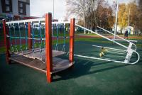 На территории учебного заведения полным ходом идёт благоустройство. Рабочие собирают спортивные и игровые комплексы, монтируют лавочки и малые архитектурные формы.