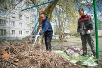 Большую территорию двора разбили на несколько участков. Дел хватило всем. Одни сгребали с газона старую листву, другие собирали смёт у бордюров. Рабочие департамента опилили старый тополь, обрезки дерева сразу подготовили для вывоза.