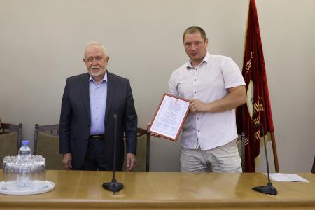 Награду коллективу вручил председатель Российского профсоюза работников промышленности Андрей Иванович Чекменёв: