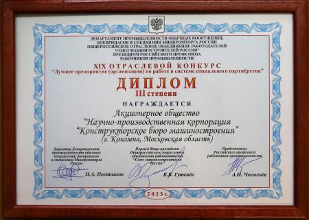 Конструкторское бюро машиностроения заняло III место в XIX отраслевом конкурсе «Лучшее предприятие (организация) по работе в системе социального партнёрства». Такое решение было совместно принято Департаментом промышленности обычных вооружений, боеприпасов и спецхимии Минпромторга России, Общероссийским отраслевым объединением работодателей «Союз машиностроителей России» и Президиумом Российского профсоюза промышленности.