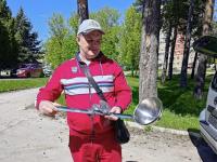 Один из главных организаторов и участников фестиваля, президент Международной ассоциации профессиональных кулинаров Валентин Лобачев демонстрирует специальные кухонные инструменты: именно такими огромными половниками будут помешивать коронное блюдо гастрономического праздника - суп из спаржи.