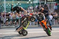 В этот день спортсменов нарушали законы гравитации, катались без рук и даже танцевали на мотоциклах. Единственная леди в команде – Дарья Харченко. Впервые за руль байка девушка села 8 лет назад. Просто кататься по городу ей было скучно. Теперь она - единственная девушка в России, занимающаяся стантрайдингом.