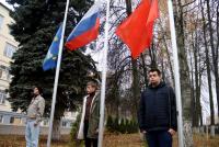 Путь коломенских волонтеров в Луганск начался от родного университета. Егору Соклакову с технологического факультета, Олегу Никитину и Максиму Искимжи с факультета истории, управления и сервиса доверили поднять флаги на торжественной церемонии, традиционно открывающей учебную неделю.