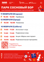 Парк «Сосновый бор» (Озёры) — вторник, 11 февраля, и среда, 12 февраля, с 15.30 до 16.00; суббота, 15 февраля, с 11.00 до 12.20.