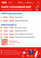 Парк «Сосновый бор» (Озёры) — суббота, 1 марта, с 11.00 до 12.20; воскресенье, 2 марта, с 13.00 до 14.00.
