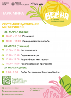 Парк Мира (Коломна) — среда, 26 марта, с 10.00 до 11.00; пятница, 28 марта, с 16.00 до 17.20; суббота, 29 марта, с 9.00 до 9.30.