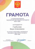 Педагогу Центра детского творчества (здание «Одиссея») Городского округа Коломна Вере Кожиной (Горбуновой) вручена памятная медаль и грамота от имени Президента Российской Федерации Владимира Владимировича Путина за вклад в подготовку и проведение Всемирного фестиваля молодёжи.