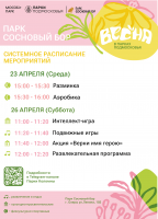 Парк «Сосновый бор» (Озёры) — среда, 23 апреля, с 15.00 до 16.00; суббота, 26 апреля, с 11.00 до 12.20.