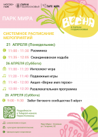 Парк Мира (Коломна) — понедельник, 21 апреля, с 11.00 до 12.05; суббота, 26 апреля, с 9.00 до 9.30 и с 11.00 до 12.20.