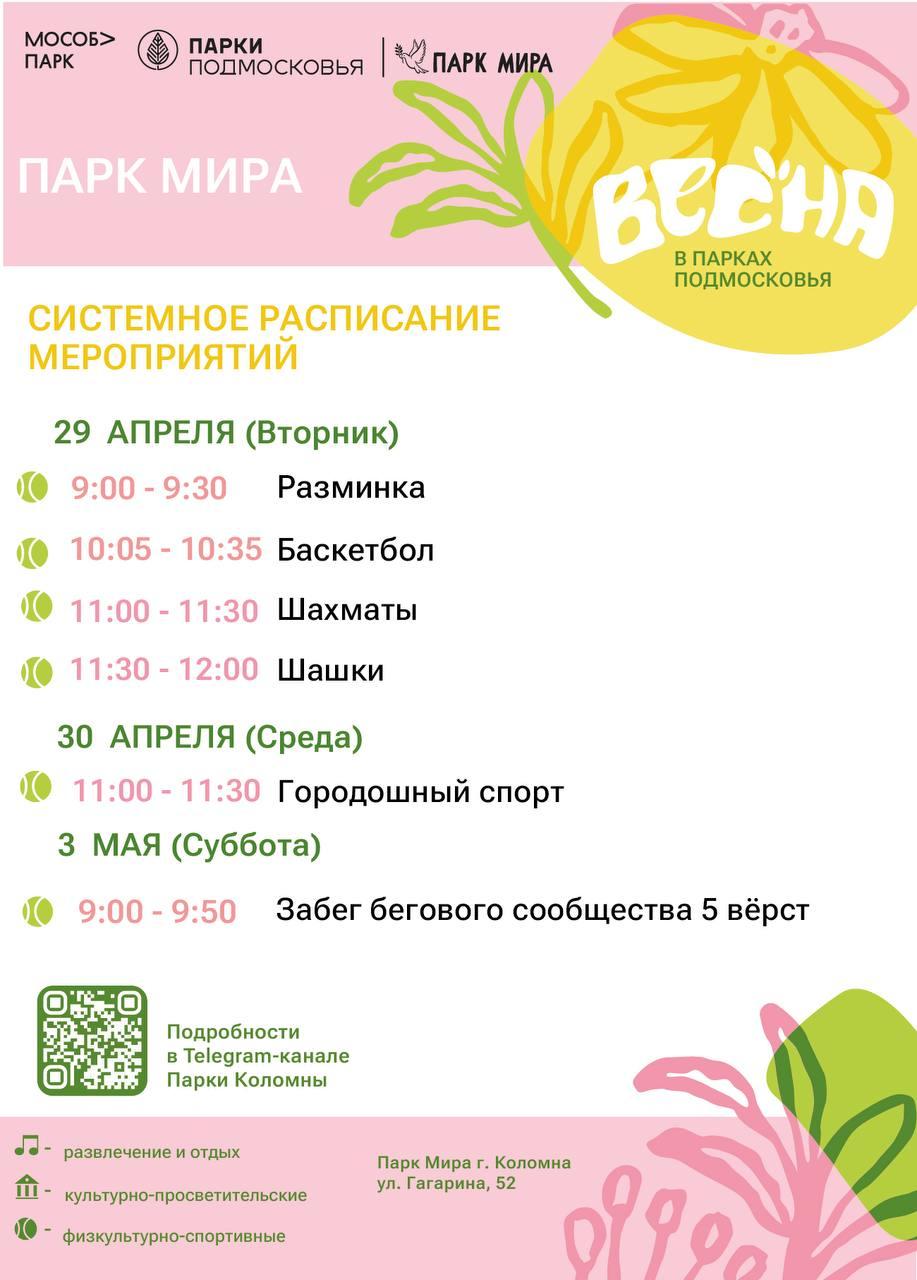Парк Мира (Коломна) — вторник, 29 апреля, с 9.00 до 12.00; среда, 30 апреля, с 11.00 до 11.30; суббота, 3 мая, с 9.00 до 9.50 и с 16.00 до 19.00.