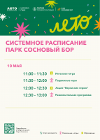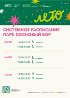 Парк «Сосновый бор» (Озёры) — понедельник, 5 мая, с 15.00 до 16.00; вторник, 6 мая, с 15.00 до 16.00; среда, 7 мая, с 14.00 до 15.00; суббота, 10 мая, с 11.00 до 13.00.