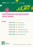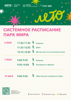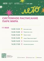 Парк Мира (Коломна) — вторник, 6 мая, с 11.00 до 12.40; среда, 7 мая, с 9.00 до 10.05; четверг, 8 мая, с 16.00 до 19.00; суббота, 10 мая, с 9.00 до 9.50; воскресенье, 11 мая, с 14.00 до 17.00.