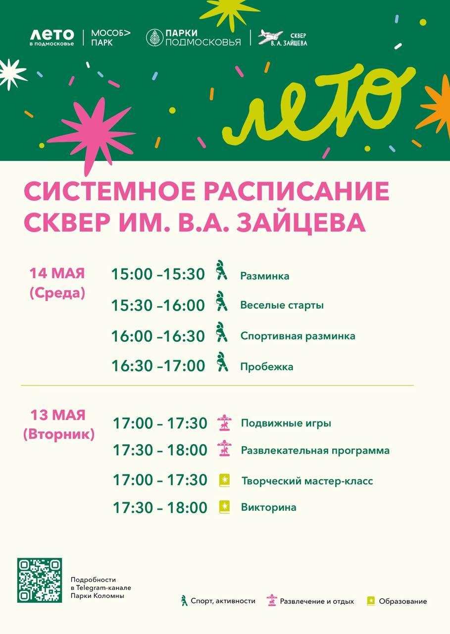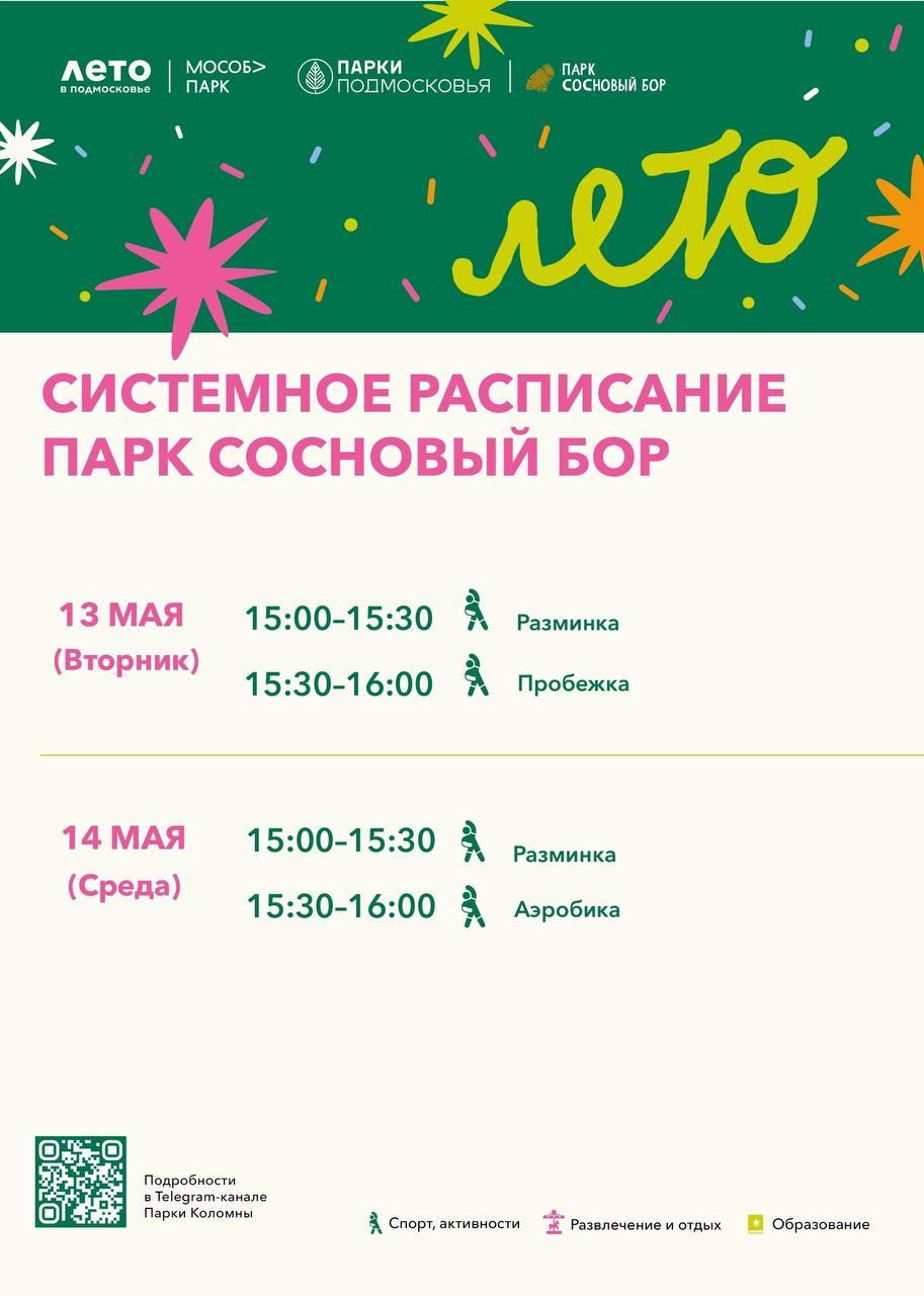 Любителей спорта и приверженцев здорового образа жизни ждут во вторник и в среду в «Сосновом бору» в Озёрах на разминку, пробежку и занятие аэробикой. Эти же два дня – вторник и среду – посвятят физкультуре в коломенском сквере имени В. А. Зайцева: здесь состоятся подвижные игры, веселые старты и другие активные развлечения. В парке Мира в Коломне в среду можно будет позаниматься легкой атлетикой, в четверг – легкой атлетикой и настольным теннисом, а в субботу – присоединиться к забегу.