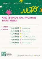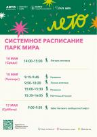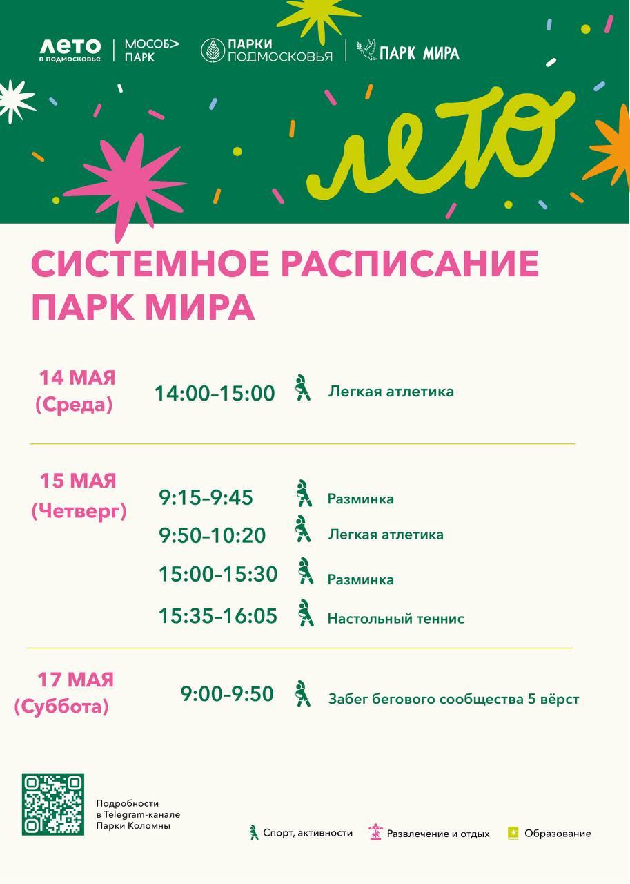 Парк Мира (Коломна) — среда, 14 мая, с 14.00 до 15.00; четверг, 15 мая, с 9.15 до 9.45 и 15.00 до 16.05; пятница, 16 мая, с 15.00 до 18.00; суббота, 17 мая, с 9.00 до 9.50.