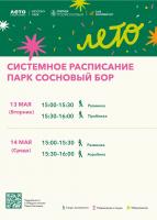 Парк «Сосновый бор» (Озёры) — вторник, 13 мая, с 15.00 до 16.00; среда, 14 мая, с 15.00 до 16.00; суббота, 17 мая, с 11.00 до 13.00.