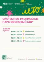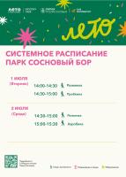 Парк «Сосновый бор» (Озёры) — вторник, 1 июля, с 14.00 до 15.00; среда, 2 июля, с 14.30 до 15.30; суббота, 5 июля, с 11.00 до 13.00.