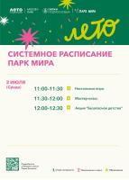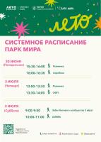 Парк Мира (Коломна) — понедельник, 30 июня, с 15.30 до 16.30; среда, 2 июля, с 11.00 до 12.30; четверг, 3 июля, с 13.00 до 14.00; суббота, 5 июля, с 9.00 до 11.00 и с 16.30 до 18.00.