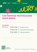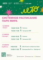 Парк Мира (Коломна) —среда, 16 июля, с 10.00 до 12.30; четверг, 17 июля, с 10.00 до 11.00; пятница, 18 июля, с 16.30 до 18.00; суббота, 19 июля, с 9.00 до 9.50 и с 10.00 до 11.00.