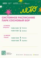 Парк «Сосновый бор» (Озёры) — вторник, 15 июля, с 14.00 до 15.00; среда, 16 июля, с 14.00 до 15.00; суббота, 19 июля, с 11.00 до 13.00.