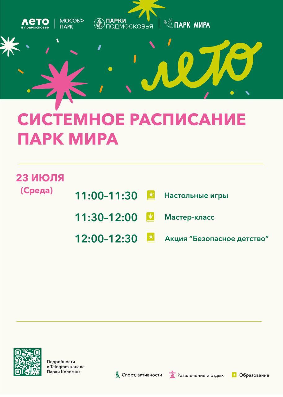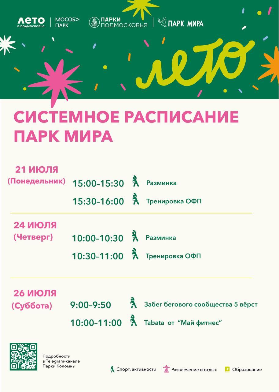 Парк Мира (Коломна) — понедельник, 21 июля, с 15.00 до 16.00; среда, 23 июля, с 11.00 до 12.30; четверг, 24 июля, с 10.00 до 11.00; пятница, 25 июля, с 16.00 до 17.30; суббота, 26 июля, с 9.00 до 9.50 и с 10.00 до 11.00.