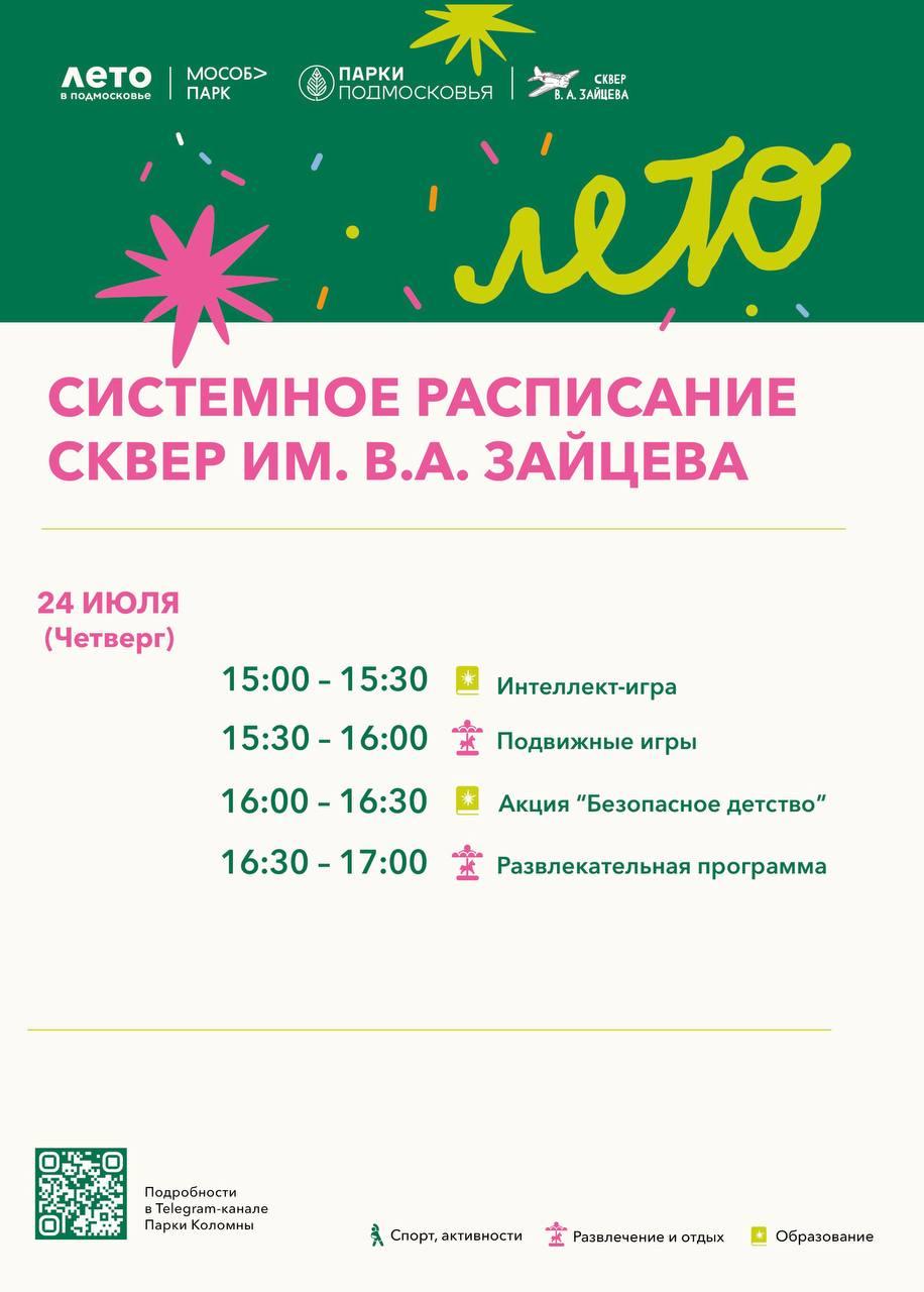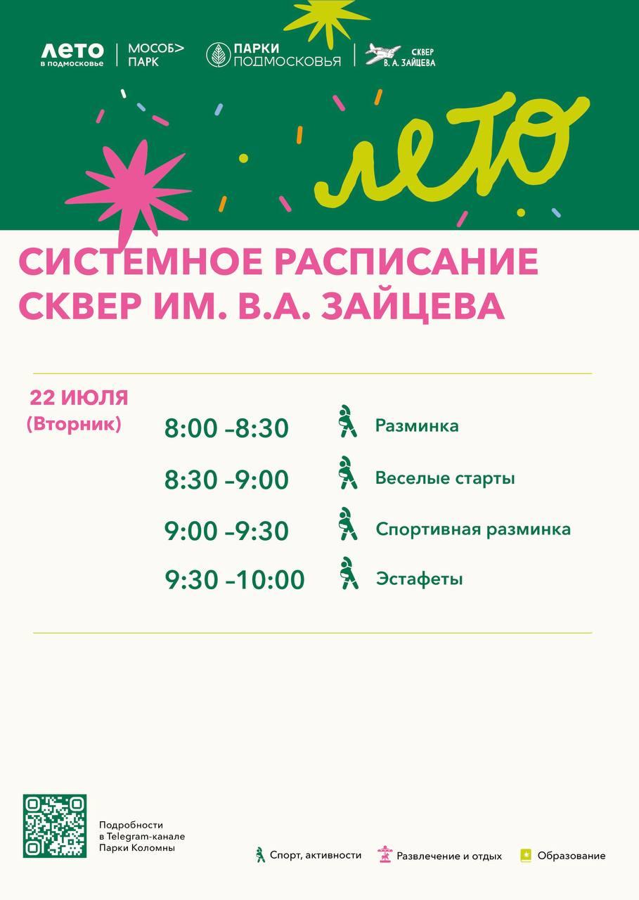 Сквер имени В. А. Зайцева (Коломна) — вторник, 22 июля, с 8.00 до 10.00; четверг, 24 июля, с 15.00 до 17.00; пятница, 25 июля, с 15.00 до 17.00.