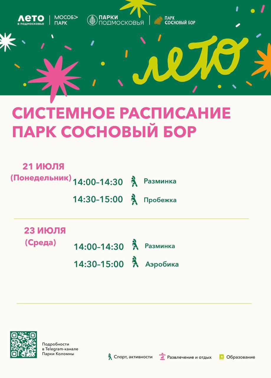 Приверженцев здорового образа жизни и любителей спорта ждут в озёрском парке «Сосновый бор» - в понедельник на пробежку и в среду на занятие аэробикой. В парке Мира в Коломне все желающие смогут поучаствовать в тренировках по общей физической подготовке в понедельник и четверг, а в субботу – в забеге и в табате по фитнесу. В коломенском сквере имени В. А. Зайцева во вторник пройдут разминка, эстафеты и веселые старты.