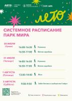 Парк Мира (Коломна) —среда, 30 июля, с 11.00 до 12.30 и с 16.00 до 17.00; четверг, 31 июля, с 16.00 до 17.00; пятница, 1 августа, с 13.00 до 14.00; суббота, 2 августа, с 9.00 до 9.50; воскресенье, 3 августа, с 16.30 до 18.00.