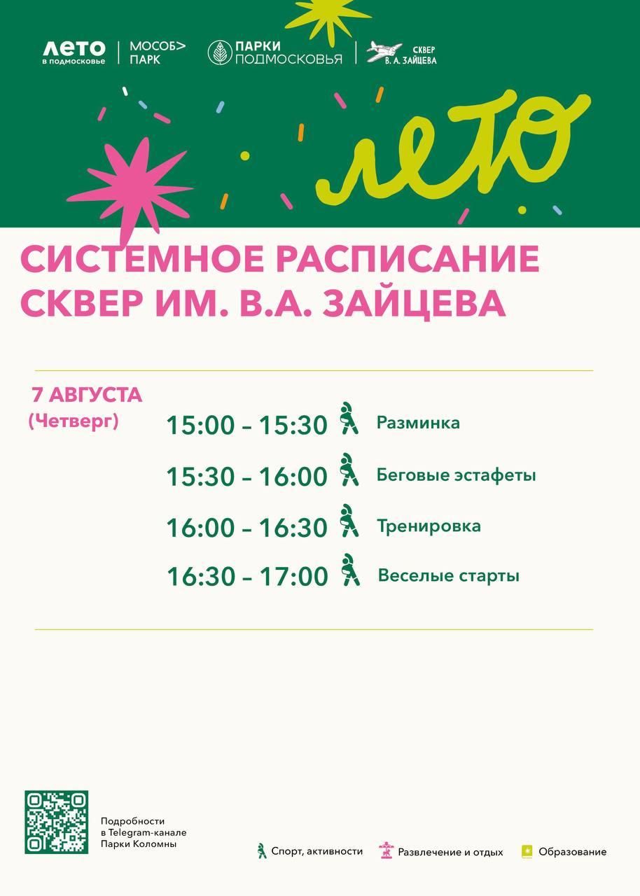 Любителей спорта и приверженцев здорового образа жизни ждут в озёрском парке «Сосновый бор» в понедельник и четверг на занятие аэробикой. В парке Мира в Коломне в понедельник состоится тренировка по воркауту, в четверг – по фитнес-аэробике, а в субботу – забег и фитнес-табата. В коломенском сквере имени В. А. Зайцева жители и гости Коломны в четверг могут поучаствовать в эстафетах и веселых стартах.