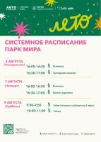 Парк Мира (Коломна) —понедельник, 4 августа, с 16.00 до 17.00; среда, 6 августа, с 11.00 до 12.30; четверг, 7 августа, с 16.00 до 17.00; суббота, 9 августа, с 9.00 до 9.50 и с 10.00 до 12.30.